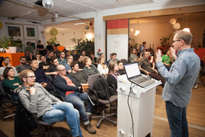 We've a monthly meetup (every last Wednesday of the month) where we have short presentations on JavaScript topics in English – everyone is welcome to join in and do talks and show us new stuff.