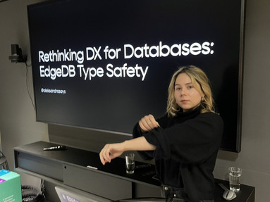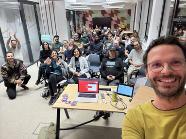 We've a monthly meetup (every last Wednesday of the month) where we have short presentations on JavaScript topics in English – everyone is welcome to join in and do talks and show us new stuff.